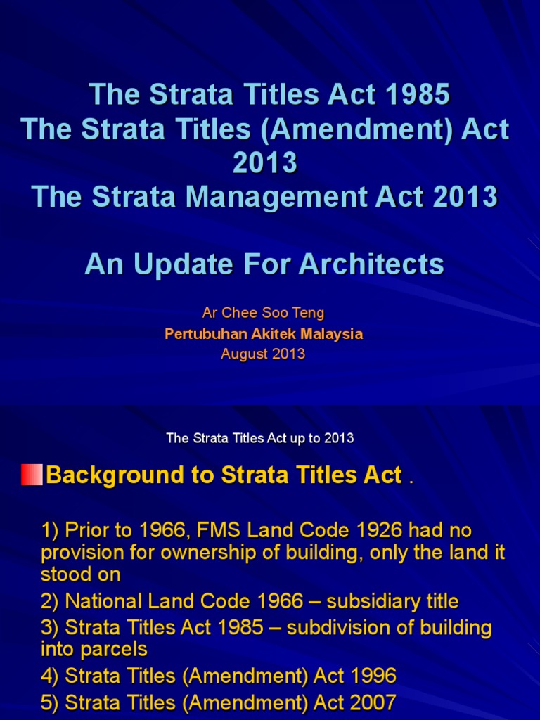 The Strata Titles Act 1985 The Strata Titles Amendment Act 2013 The Strata Management Act 2013 An Update For Architects Land Lot Civil Law Common Law