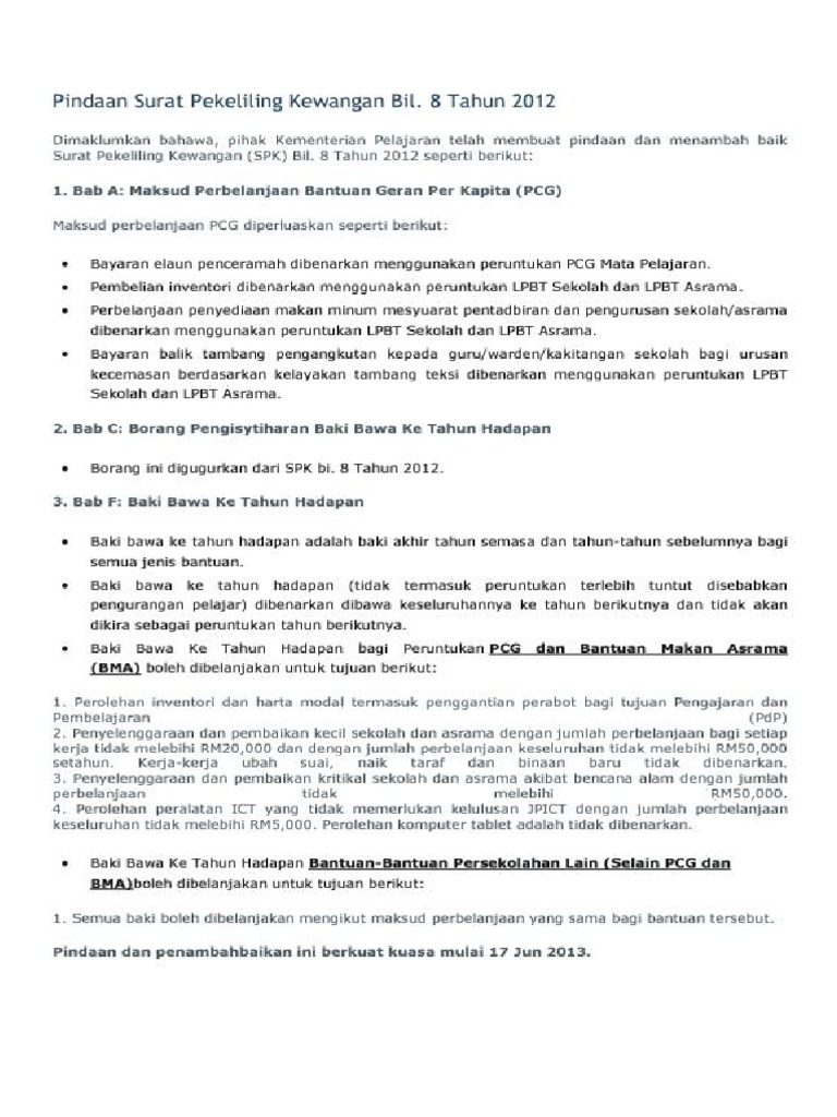 Spk 8 Tahun 2012 Pdf Surat Pekeliling Kewangan Bilangan 8 Tahun 2012 Garis Panduan Pengurusan Kewangan Peruntukan Bantuan Persekolahan Ke Sekolah Course Hero