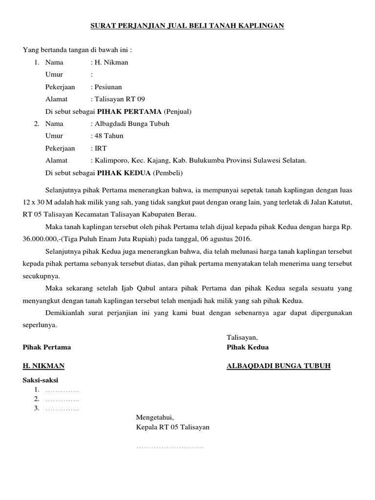 Surat Perjanjian Jual Beli Tanah Kaplingan Docx