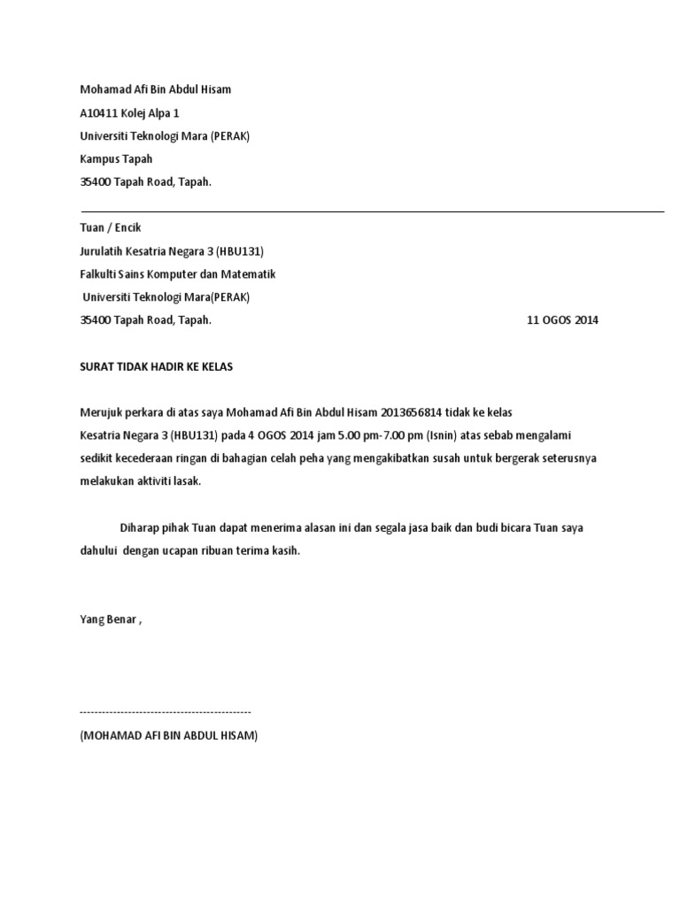 Contoh Surat Rasmi Tidak Hadir Ke Kuliah