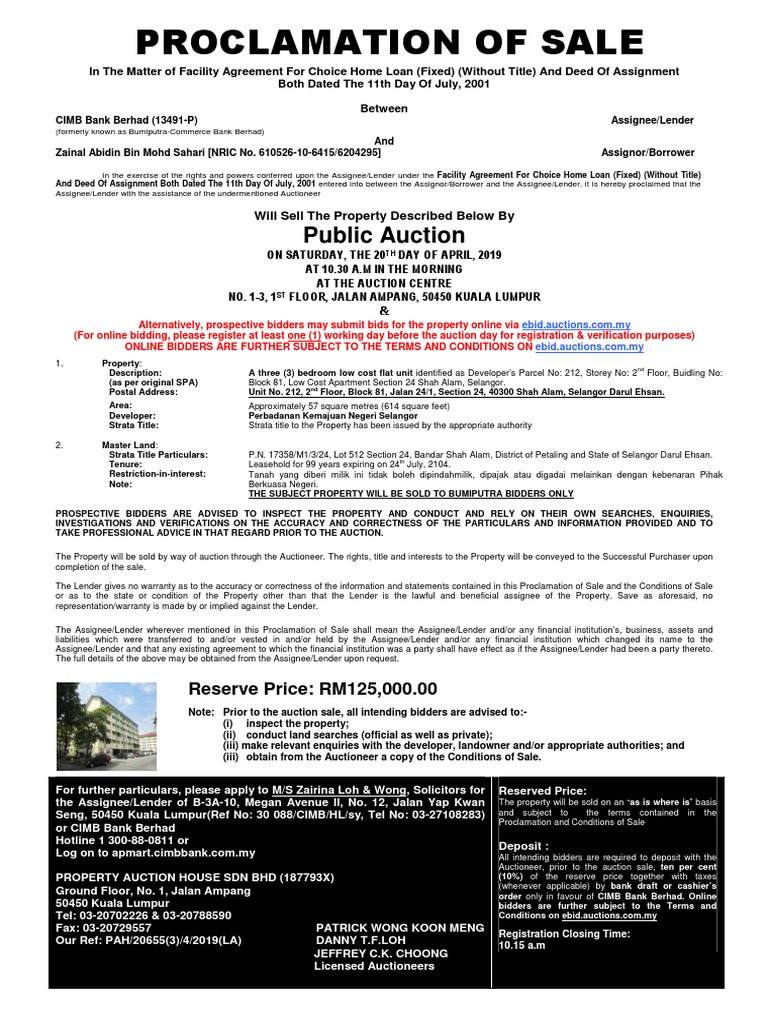 Proclamation Of Sale Public Auction Assignment Law Auction